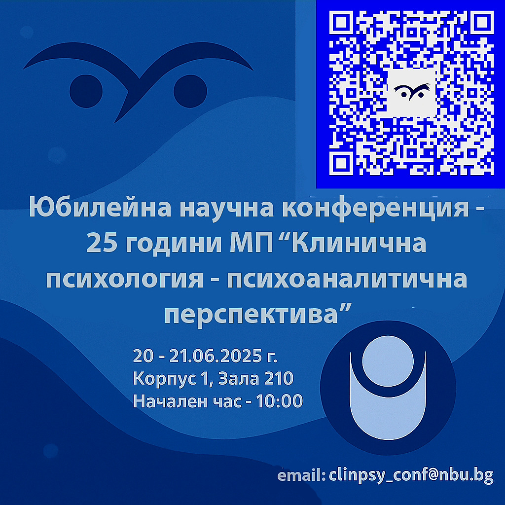 - ЮБИЛЕЙНА НАУЧНА КОНФЕРЕНЦИЯ 25 ГОДИНИ МАГИСТЪРСКА ПРОГРАМА „КЛИНИЧНА ПСИХОЛОГИЯ – ПСИХОАНАЛИТИЧНА ПЕРСПЕКТИВА“ 20 – 21.06.2025 г.